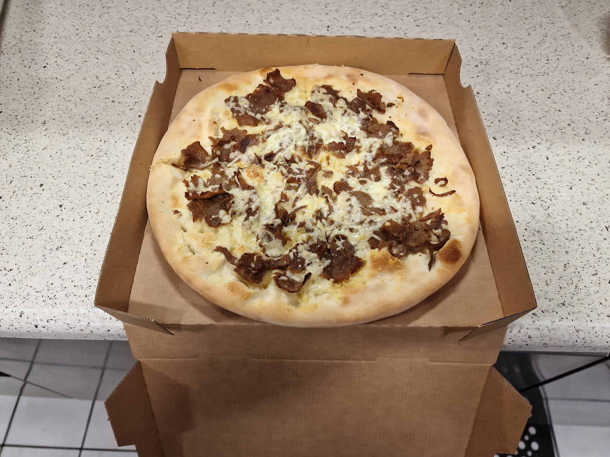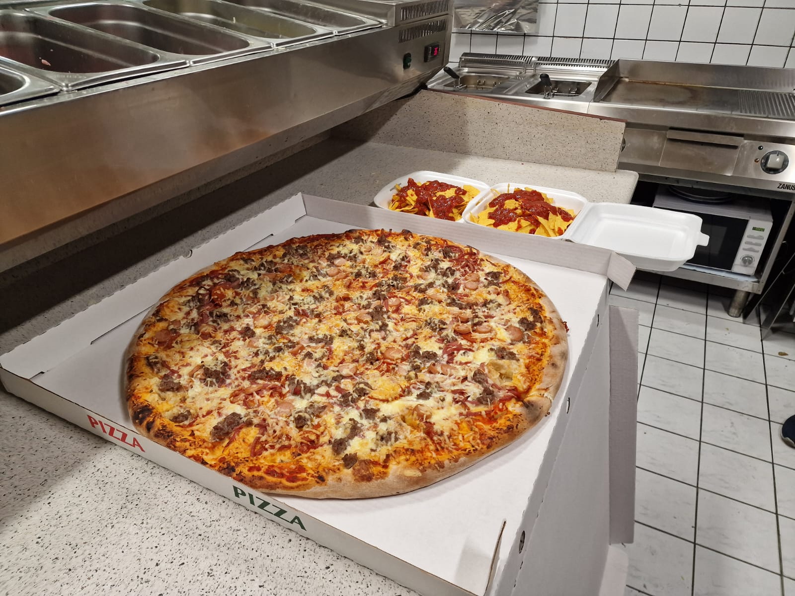 Tomat, ost, kebab, pepperoni, pommes frites, dressing.