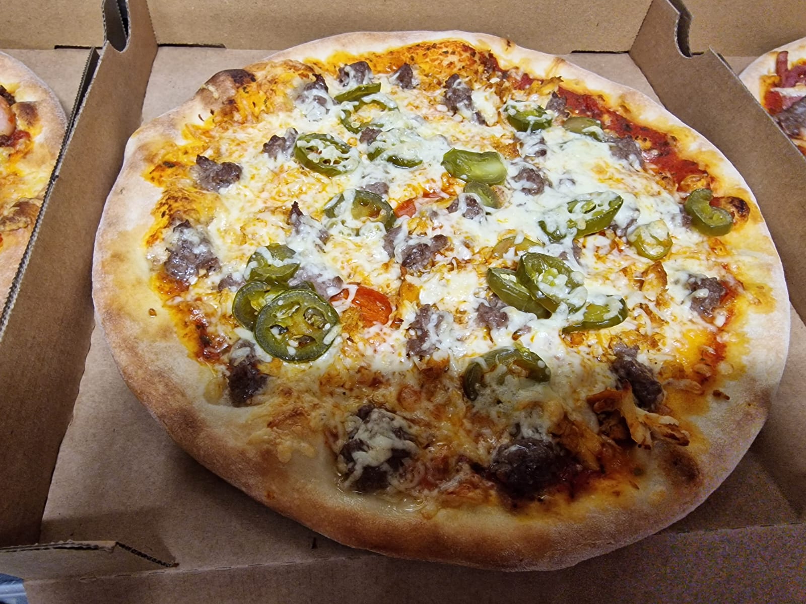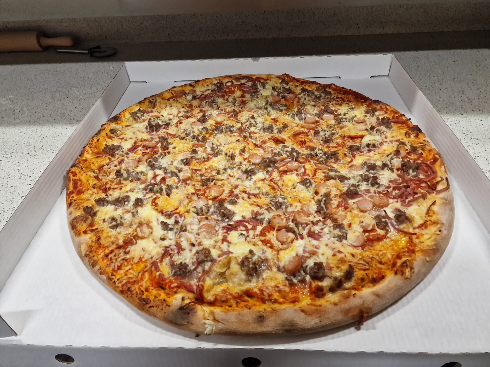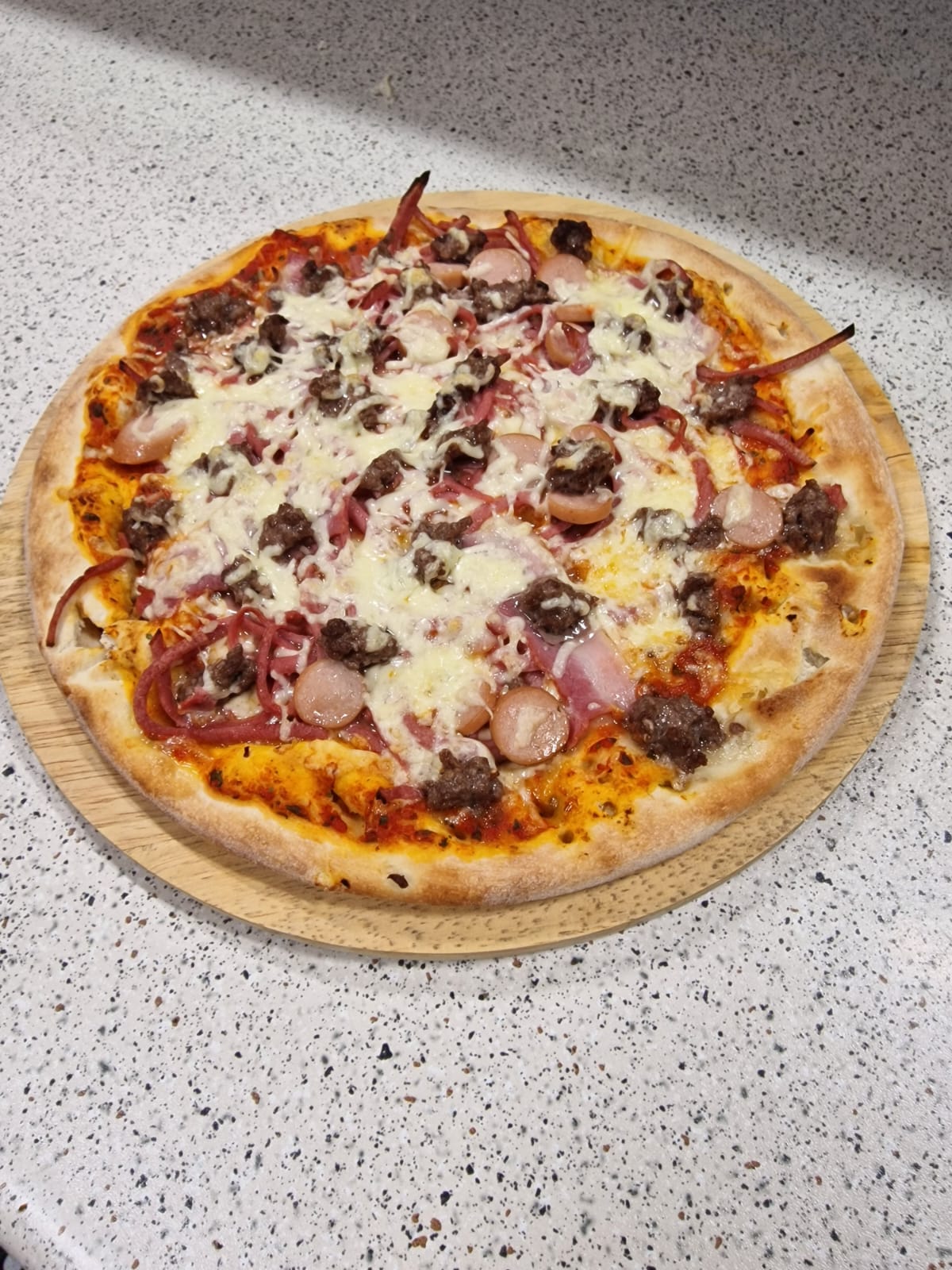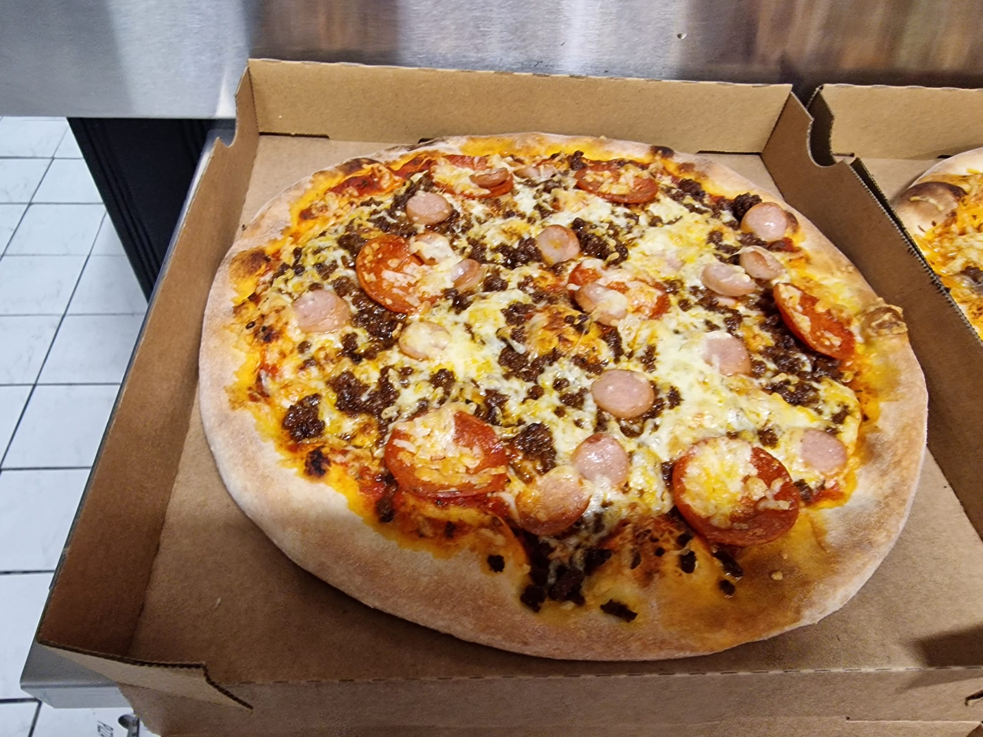 Tomat, ost, pepperoni, oksekød, kylling, jalapenos.